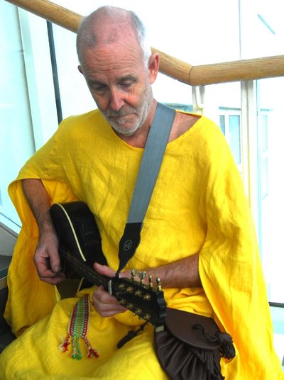 The iconic male Léine was nearly always of a yellow colour, very rarely white or undyed. The Léine was an ankle-length linen tunic which was then hitched up through a belt to reach knee level; by hitching the tunic up, a large, overhanging bag of material formed around the waist area. The Léine also had large, hanging, bulbous sleeves that usually reached to about the knees, but the more gallant and rich would have the sleeves reach as low as the calves. The arming hole was at the elbow or slightly below. The female Léine was mainly white but occasionally yellow, and it was always worn at full length. Young, unmarried females often wore it alone, but older, married women always wore a Gúna (dress, gown) on top. The arming hole on the female version was much lower at the wrist.